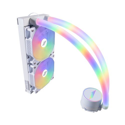 1stplayer MT 240 Mothra is a White-colored ARGB Liquid CPU Cooler. The RGB water cooling tubes with crystal clarity and support for 5V RGB synchronization, together with the aRGB water block and aRGB cooling fan, create a synchronized light effect circulation system.  Using the rare high-speed cooling fan for cooling. The fixed-bearing water pumps up to 2500RPM have a stable start and low noise while taking into account the quiet and shockproof performance. The physical parameters of the boiling point: 150a„ƒ, freezing point: -20a„ƒ prevent the formation of flocculation after long-term use of the coolant, which will cause the cooling effect to drop and block the water channel. It supports Intel LGA 775/115x/1366/2011/2066 and AMD AM4/FM2/FM1/AM3/AM2/FM3 CPU sockets. The materials used in the head are Pure Aluminum Blocks. It comes with a Mirror Water Cooling with ARGB lighting effect(5V interface), the lighting effects such as breathing, color-by-color, etc. that come with the motherboard ARGB software can be fully displayed one by one. It features a 2400 Rpm Silent Water Pump. The fan speed is 2500 RPM A+ 10% with a Noise of less than 30dB. The Connector is 3Pin+ARGB with a Rated Voltage of 12V DC and a Rated Current of ≤0.30A. The Power Consumption is a‰3.6W with a 200 Watt CPU power at max. And in terms of silence tuned to the ideal value to meet the use of high-performance players. It also has Temperature Controlled 9 Blades Fan (600-1500RPM) with  Noise Reduction Feature. It supports 5v RGB Sync with Motherboard (ARGB) On Pump Head & Cooling Fan.1stplayer MT 240 Mothra ARGB Liquid CPU Cooler offers 2 year Warranty.