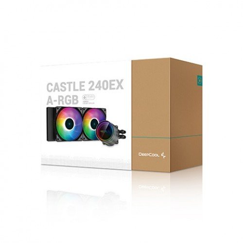 The Deepcool CASTLE 240EX A-RGB AIO liquid CPU Cooler delivers fantastic RGB lighting with two Deepcool CF120 A-RGB PWM fans and our iconic infinity mirror in a 240mm radiator. It features 5V Addressable RGB with motherboard software support. The iconic Deepcool Castle EX infinity mirror pump design with a new twist. Efficient pump design optimized for performance and noise. See the new Deepcool logo on an enlarged mirror chip for a new instant classic. It features Anti-Leak Technology and a Swappable custom logo. A stronger 3-phase motor provides higher cooling performance with an increased flow rate while keeping noise levels low. Large copper cold plate with 25% more skived fins (Supports TR4). Easily change orientation by twisting off the pump face to adjust the logo. Take it to the next level with your own custom design using the included extra logo chip. It is applicable For Intel LGA 2066/ 2011-v3/ 2011/ 1200/ 1151/ 1150/ 1155/ 1366 AMD TRX4/ TR4/ AM4/ AM3+/ AM3/ AM2+/ AM2/ FM2+/ FM2/ FM1 It has 3 years warranty.